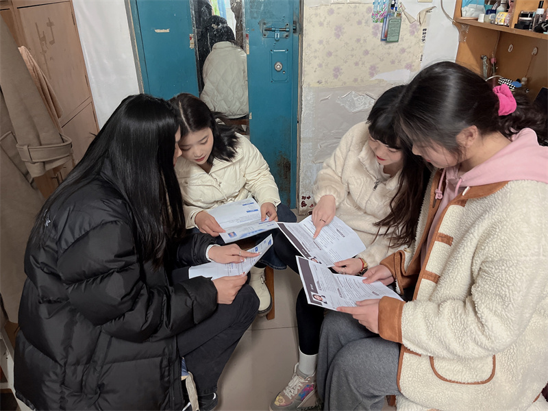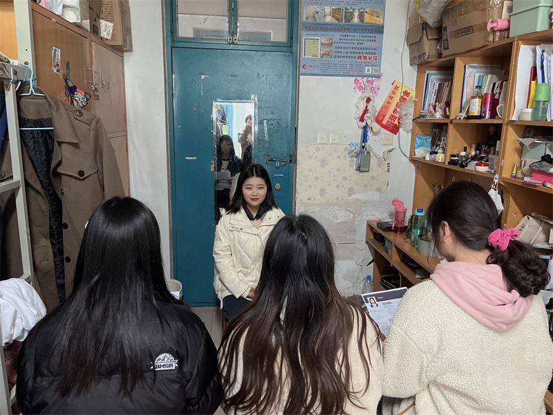 在“宿舍模拟面试”活动中,学生们可以相互扮演面试官以及面试者,从不同的角度分析并找出面试技巧,为以后找工作面试做铺垫。