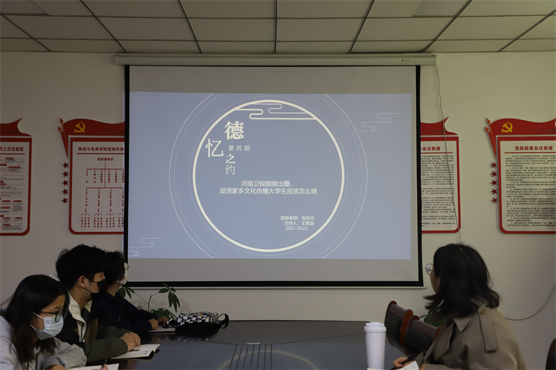 首先,由主持人王聚源以“河南卫视频频出圈”的话题引出本次会议的主题“促进家乡文化传播,大学生应该怎么做?”。在播放了《唐宫夜宴》、《祁》两段展现大唐风华的视频后,同学们依次发表自己的想法和感受。有的同学说,大学生在自我认知正确的前提下,要积极鼓动身边的人参与到发扬传统文化的热潮中来,主动担当起引领文化潮流的角色。还有同学说,大学生应该从自身做起,积极在课外汲取传统文化知识,利用图书馆、计算机等资源,增加自身传统文化底蕴,中华民族的优秀文化不应只是书本上的文字,更应该在应用中继承与发扬。