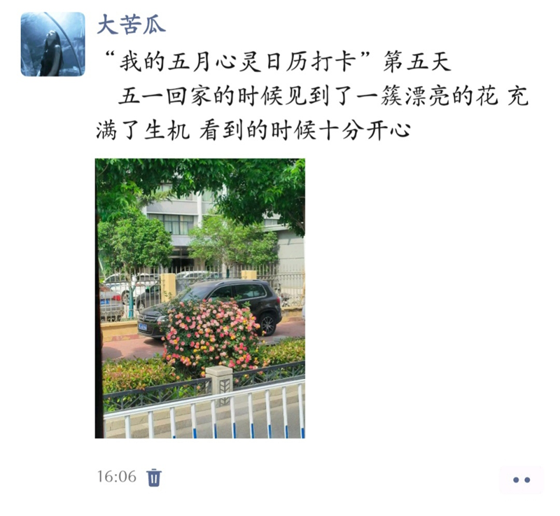此次“我的五月心灵日历”心理健康打卡活动的展开,展现出我院对学生心理健康教育的重视。未来我院将继续举办更多形式多样的心理健康活动,为构建更加和谐、健康的校园氛围而努力!