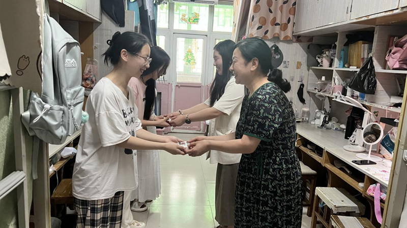 在发放过程中,领导和老师叮嘱同学们夏季高温注意防暑降温,增强防暑防汛意识。同时在走访宿舍期间对宿舍安全进行检查,提醒同学们高温时期要注意灭蚊用品和用电安全,增强安全防护意识,养成良好的生活习惯,保持宿舍卫生环境,以良好的精神状态认真复习备考。