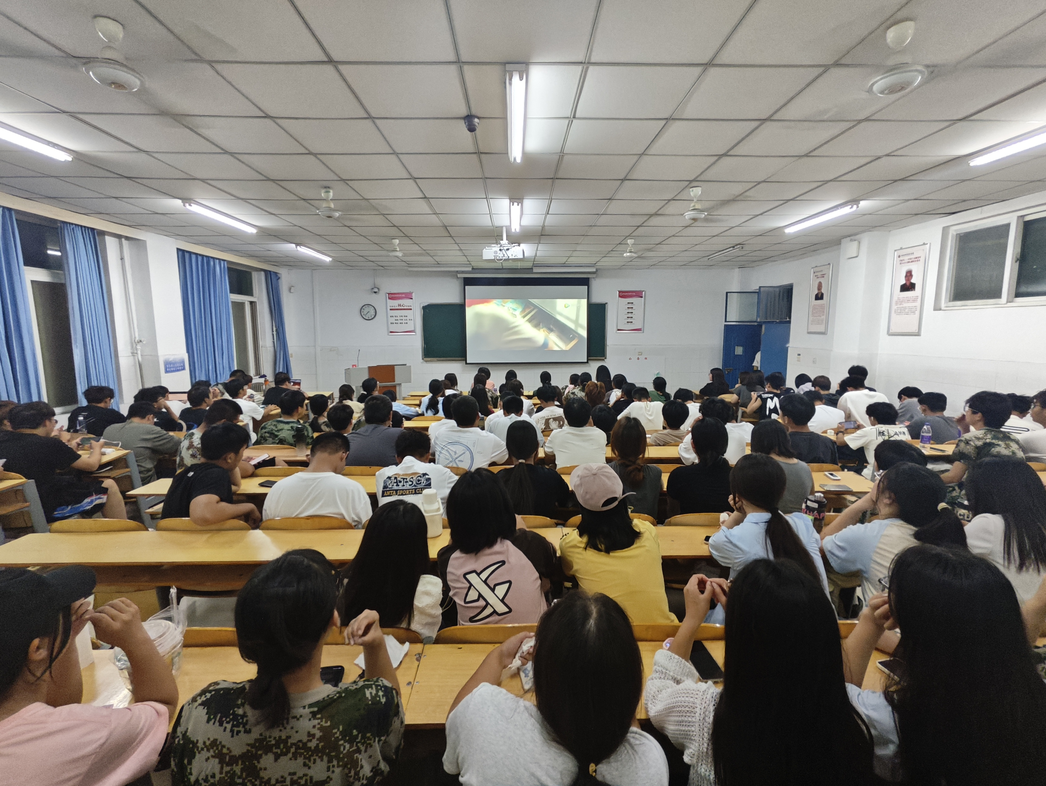 活动开始前同学们有序进场,在班级助理的组织下落座,随着声音的出现同学们一双双眼睛投向屏幕。现场观看的是经典爱国主义影片《我和我的祖国》,该片领同学们重温了新中国70年的峥嵘岁月。该片在每个故事开始之前都安排了一个手写文字的介绍,有的用钢笔,有的用毛笔,有的则用铅笔,这一运用给同学们提供了思考的空间,也为故事增加了让同学们深刻体会到“我”与中国的血脉相连,激发了同学们内心最朴素的爱国情怀。《我和我的祖国》既是一部献礼的影片,更是一封写给祖国的情书,用“我”的故事、“我”的经历、“我”的感动向祖国表白。活动结束后同学们依次离场。