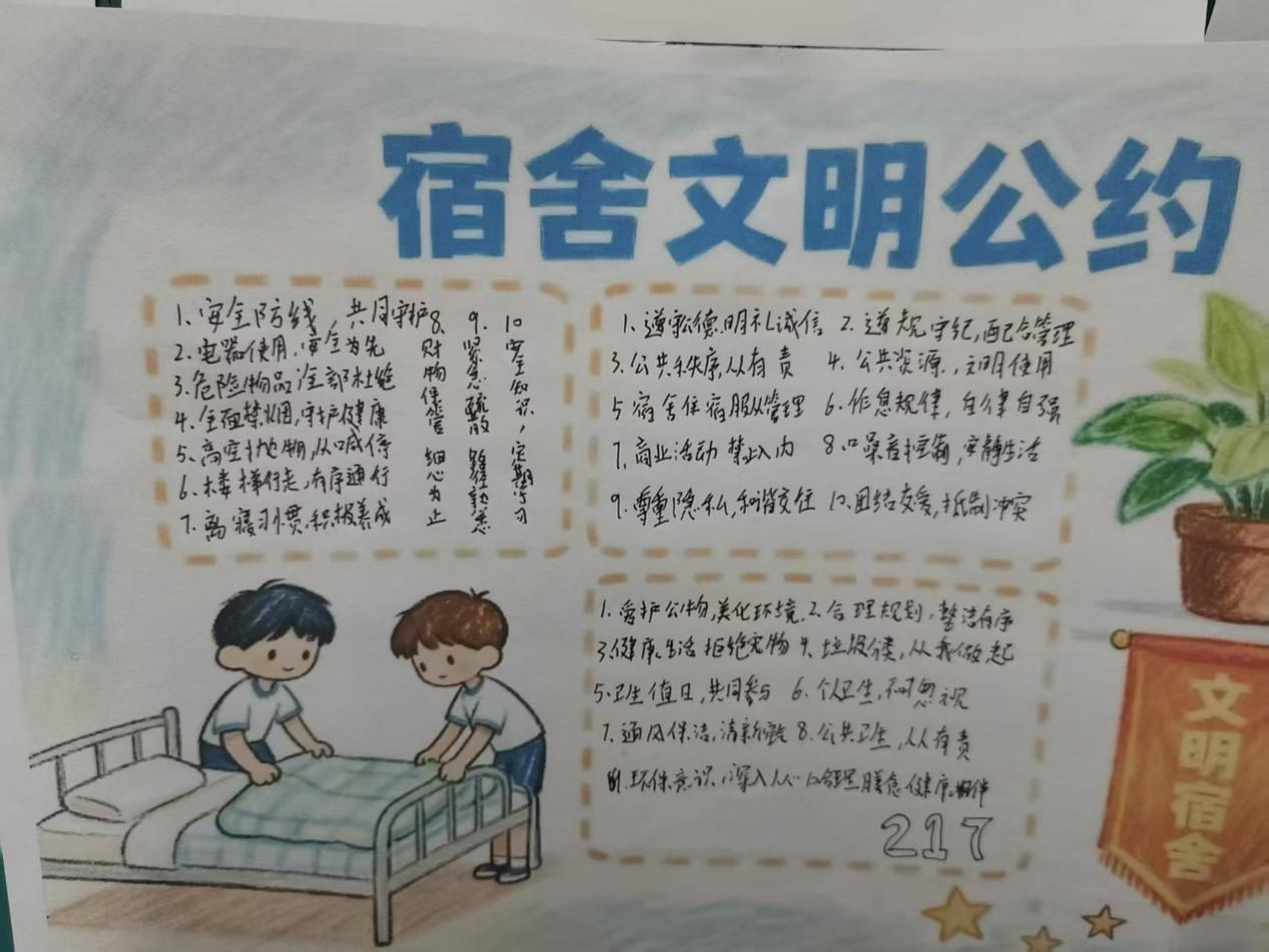 此次活动让同学们在创作与实践中深化文明宿舍建设意识,将“文明”理念转化为具体可守的宿舍约定,为打造整洁有序、温馨友爱的宿舍环境,为推进校园文明建设奠定了坚实基础。