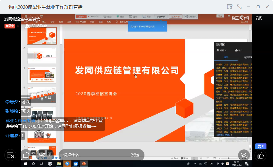 为了在疫情期间促进我院毕业生与企业的交流,4月24日16:00,williamhill英国成功举办了上海发网供应链管理有限公司的空中招聘宣讲会。此次宣讲会以直播形式在毕业生钉钉群内开展,由上海发网招聘负责人戴经理主讲,我院一百多名毕业生参加了此次宣讲会。