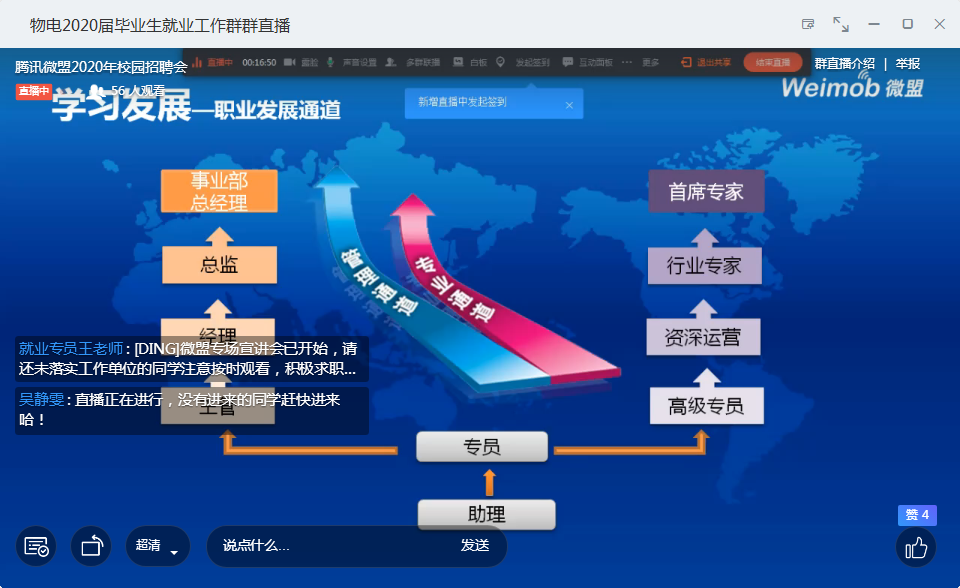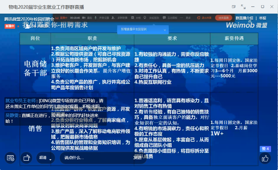 为帮助尚未落实工作单位的毕业生在离校前找到心仪工作,5月25日14:30,williamhill英国在毕业生钉钉群内以直播形式开展了“腾讯微盟2020年校园专场宣讲会”。宣讲会由腾讯微盟郑州分公司人事经理张蓓主讲,我院六十多位毕业生观看了宣讲会直播。