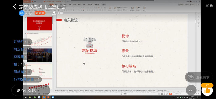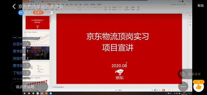 为切实做好毕业生威廉希尔服务工作,加强我院与企业联系,让毕业生更加深入了解职场信息,明确自我就业方向,11月18日晚七点,我院于钉钉会议群组织开展京东物流华北分公司企业线上专场宣讲会。参加本次宣讲会的有京东物流华北分公司招聘负责人、2021届毕业生以及我院威廉希尔服务中心工作人员。