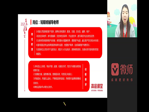 求职毕业生通过扫码进入高途课堂牧院专场招聘群。招聘官曹雨倩通过群公告,提醒大家此次空中宣讲会需要提前网申报名,并依次给投递简历的毕业生发送此次直播链接。据了解高途课堂是跟谁学旗下专注于中小学在线教育品牌。跟谁学是中国第一家在美国上市的在线教育公司,是目前全球市值最大的在线教育机构,公司发展潜力巨大。高途课堂采用目前十分新颖的“名师授课+双师辅导”的在线直播双师模式。受知识付费这一时代大洪流影响,“科技让教育更美好”是高途课堂提出的使命,吸引大量专属用户。招聘负责人非常耐心解答同学们所提有关公司前景、薪酬福利、上升渠道等问题。此次招聘会所提供岗位为 "星途计划”—长期班辅导老师以及短期班辅导老师,入职即缴纳“六险一金”,工作环境轻松愉悦,员工福利优越。宣讲会结束后,随即对求职者进行线上面试。