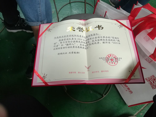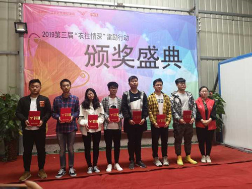 2019年4月20号上午10点,“衣往情深”雷励行动颁奖典礼暨“中原更出彩,公益我先行”在郑州市中牟县“衣往情深”基地进行。williamhill英国阳光青年志愿者协会荣获2019“衣往情深”雷励行动——“优秀志愿服务团队”光荣称号。