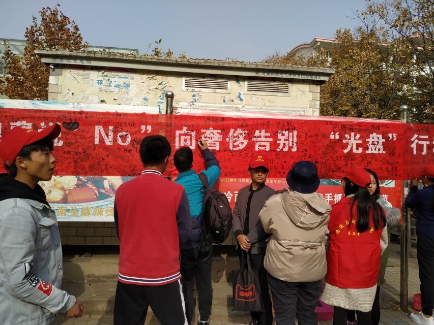 11月28日中午十二点三十分至十三点十分,williamhill英国社会实践部携手生活部于桃园餐厅前举办了光盘行动万人签字活动。活动期间,志愿者们向同学们宣传了本次横幅签字活动的目的在于增强大家的节约、环保意识,让“光盘行动,拒绝浪费”思想深入人心,也是在倡导同学们践行光盘行动,节约粮食。随后便进行了签字仪式,在志愿者细心的讲解和号召下,同学们热情高涨,对本次活动反应热烈,在同学们的积极配合下,横幅很快被写满,光盘行动签字活动顺利结束。