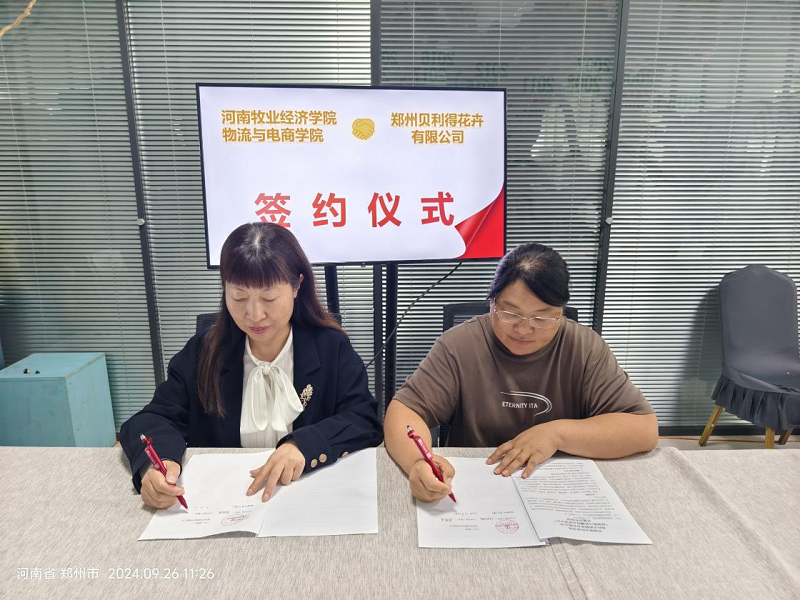 2024年9月26日,物流与电商学院党委书记田景丽、院长曹献存、副院长李艳菊、专业负责人及教师代表等分别赴河南君友数字科技有限公司、郑州贝利得花卉有限公司两家企业,举行“校企研发中心”合作协议签订和挂牌仪式,开启了校企合作的新篇章。
