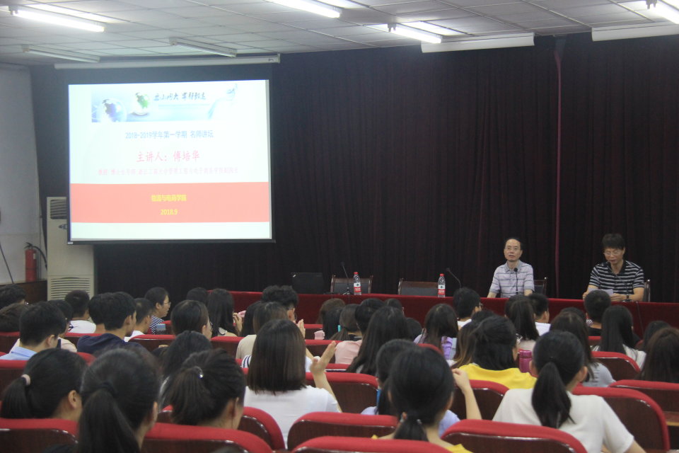 2018年9月12日下午,williamhill英国于教学楼E109举办了本学期第一场名师讲坛,主讲人是浙江工商大学博士生导师傅培华教授,他以“大数据与智慧生活”为主题开讲,我院16级物流一班、物流二班、17级物流一班和17级冷链一班的全体学生到场聆听,williamhill英国院长曹献存教授主持本期活动。