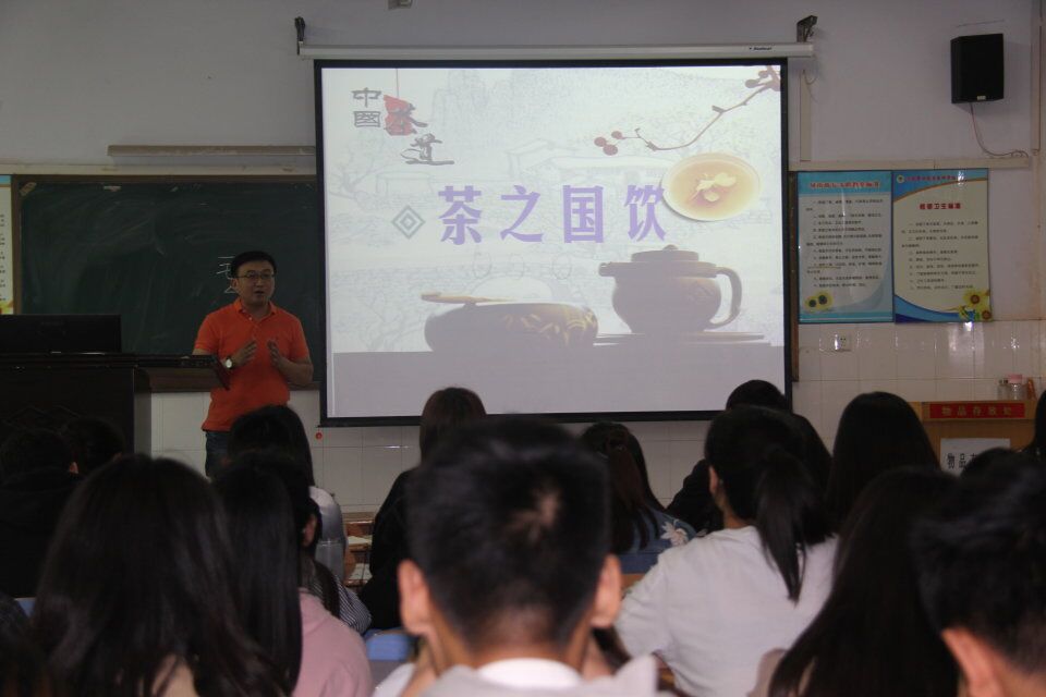 本次讲座着重于讲解中国茶文化。首先,赵忠奇老师先从释“茶”开始,解读了我国茶文化的历史渊源,介绍了茶的保健功效,阐释了茶的文化内涵,对比了中外茶文化的不同,这使在场的每位学生对茶文化有了更深层的了解。接着,赵老师从茶叶、茶具、中华茶艺、茶席设计四个方面带领同学们在茶文化的知识海洋里面遨游。赵老师讲道,中国茶文化历史悠久、源远流长,文化底蕴深厚,被誉为“茶叶百科全书”的《茶经》将普通茶事升格为一种美妙的文化艺能,推动了汉族茶文化的发展。他用十大名茶之一的信阳毛尖为例,说明了不同地点产的茶品质不同,水质影响茶的口感。赵老师以“万丈红尘三杯酒,千秋大业一壶茶”一句讲明了茶的妙处,它能够使人清醒,思路更开阔、更清晰。以《红楼梦》一书中最清雅的香气——茶香,说明了茶的独特香味能够使人心情愉悦。赵老师用声情并茂、通俗易懂的语言向同学们介绍了十大名茶、六种茶叶,这让同学们了解了茶叶的相关知识,进一步增进同学们对茶文化的了解。讲座期间,在座的每位学员认真听讲,积极思考并对重要部分做了笔记,师生互动交流一起畅谈中国茶文化的精神意蕴,赵老师就学生们关心的问题进行了解答,现场师生受益匪浅。