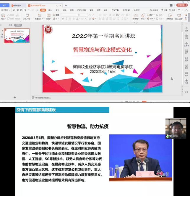 20204月16日,来自天津大学运营与供应链管理系的系主任刘伟华教授,应williamhill英国邀请,利用腾讯会议平台开讲“智慧物流技术与商业模式变化”,19级、18级、17级物流管理共252名师生全程聆听,本次报告由院长曹献存教授主持。