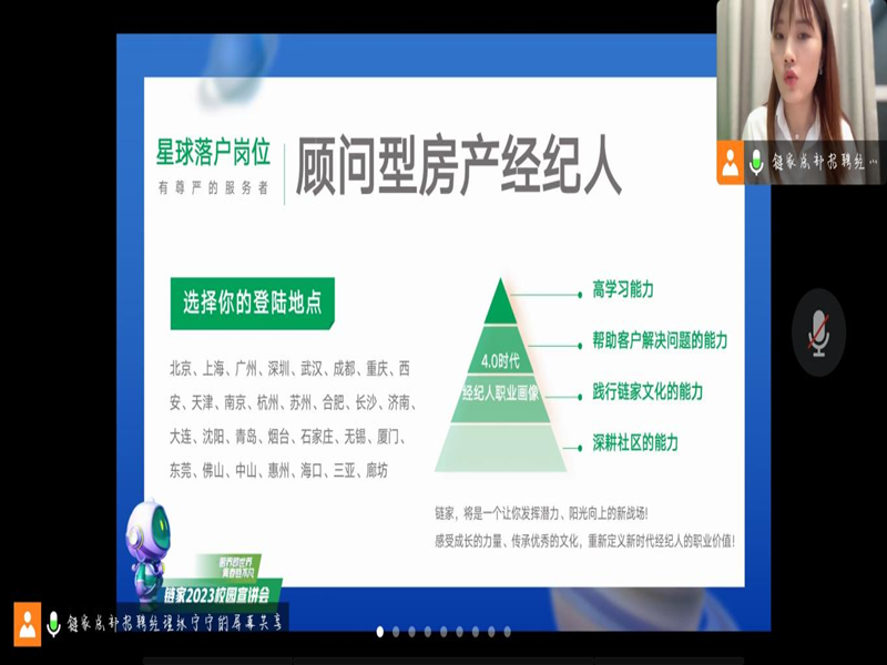 为给williamhill英国毕业生提供充足就业机会,同时深化校企合作工学结合的人才培养模式,实现校企双赢。经过我院就业专干和校招联系人刘阳老师与企业前期沟通,了解毕业生需求后,于11月8日晚19:00我院举办链家秋招线上宣讲会,2023届毕业生以及科创部相关人员参与此次宣讲会。