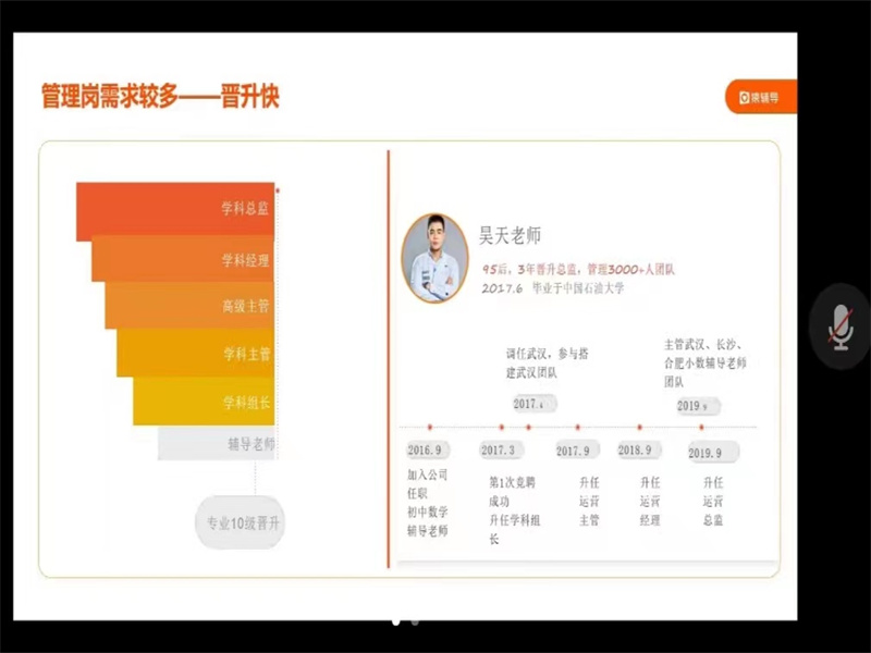 宣讲会上,猿辅导HR张巍女士展开讲解,同学们对猿辅导有了更进一步的了解。此次招聘系统班辅导老师,系统班辅导老师岗位区别于传统的教师职业,具有强互联网属性,岗位职责包括学情分析,辅导服务,用户运营以及转化续报等。上班时间为每周二到周六每天的13:30到21:30。在薪资方面,系统班辅导老师底薪3000元,补贴500元,再加上绩效工资,综合月薪为5000-9000元,课程顾问以及短期班助教底薪3000元,补贴500元,首月保底绩效1500元,加上提成工资,平均月薪6000-12000元。公司管理岗需求较多,晋升快,对此张巍女士为同学们列举中国石油大学昊天老师的例子,昊天老师3年晋升总监,如今管理3000人的团队,这充分体现了公司的晋升快、机会多。本次招聘岗位对应聘者的要求是:专科及以上学历,专业不限,应届往届均可,要有较强的沟通能力和服务意识,以及执行能力和抗压能力,要具有互联网思维,愿意投身在线教育。宣讲会的最后是答疑环节,张巍女士一一回答了毕业生们的疑问。