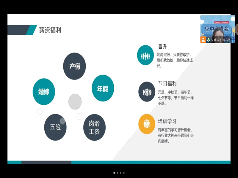 会议伊始,乐畔人力资源负责人刘莉愿女士为毕业生播放了企业宣传片,向大家展示了河南乐畔电子商务有限公司的发展历程与企业文化,让同学们对企业有了初步了解,河南乐畔属于创新型电商平台,以传统电商+新型电商为一体的模式。而后,刘女士通过PPT展示的方式,向同学们更全面的介绍公司本次招聘岗位的要求。本次的招聘岗位有带货主播(抖音/淘宝),招聘人数为20人,薪资为8000——15000元;直播场控(抖音),招聘人数为5人薪资为4000——6000元;编导,招聘人数为3人,薪资为4500元+提成;剪辑,招聘人数为3人,薪资为4500元+提成;客服(售前/售后),招聘人数为4人,薪资为4000——10000元;采购,招聘人数为1人,薪资为4000——7000元;管培生,招聘人数为5人,薪资为5000元。入职员工享有丰厚福利,如年假、产假、五险一金、节日福利等。在最后的提问环节,部分毕业生提出了一些疑问,刘女士一一解答,会议取得圆满结束。