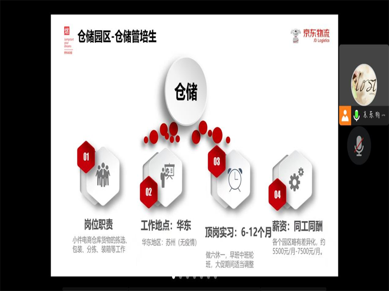 为给williamhill英国毕业生提供充足见习机会,同时深化校企合作工学结合的人才培养模式,实现校企双赢。经过我院就业专干和校招联系人刘阳老师与企业前期沟通,了解毕业生需求后,于12月1日晚19:30我院举办京东物流华东区线上宣讲会,2023届毕业生以及科创部相关人员参与此次宣讲会。