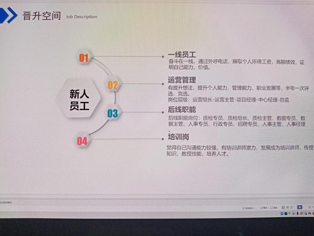 宣讲会上,吕女士通过PPT对公司进行了介绍,从中我们了解到∶百思特现在正逐步发展为集房地产服务、呼叫中心服务为一体的现代化新型企业,是海淀区高新技术企业,是北京乃至全国从事呼叫中心规模最大的企业。本次公司招聘对象为:兴业银行业务客户顾问,有呼叫中心工作或者金融行业工作经验者优先。随后吕女士还我们介绍了公司员工的晋升空间,让我们对于公司的晋升途径和渠道有了初步了解,也让我们了解到了晋升后的职位与待遇。公司坚持以人为本,公司提供的相关员工关怀及福利,培训期带薪培训7天,薪资为底薪+绩效+津贴补助+月度奖金的模式,对毕业生们表现出了很大的吸引力。公司办公环境优美,福利待遇优厚,为毕业生们提供了一个不错的机遇与平台。