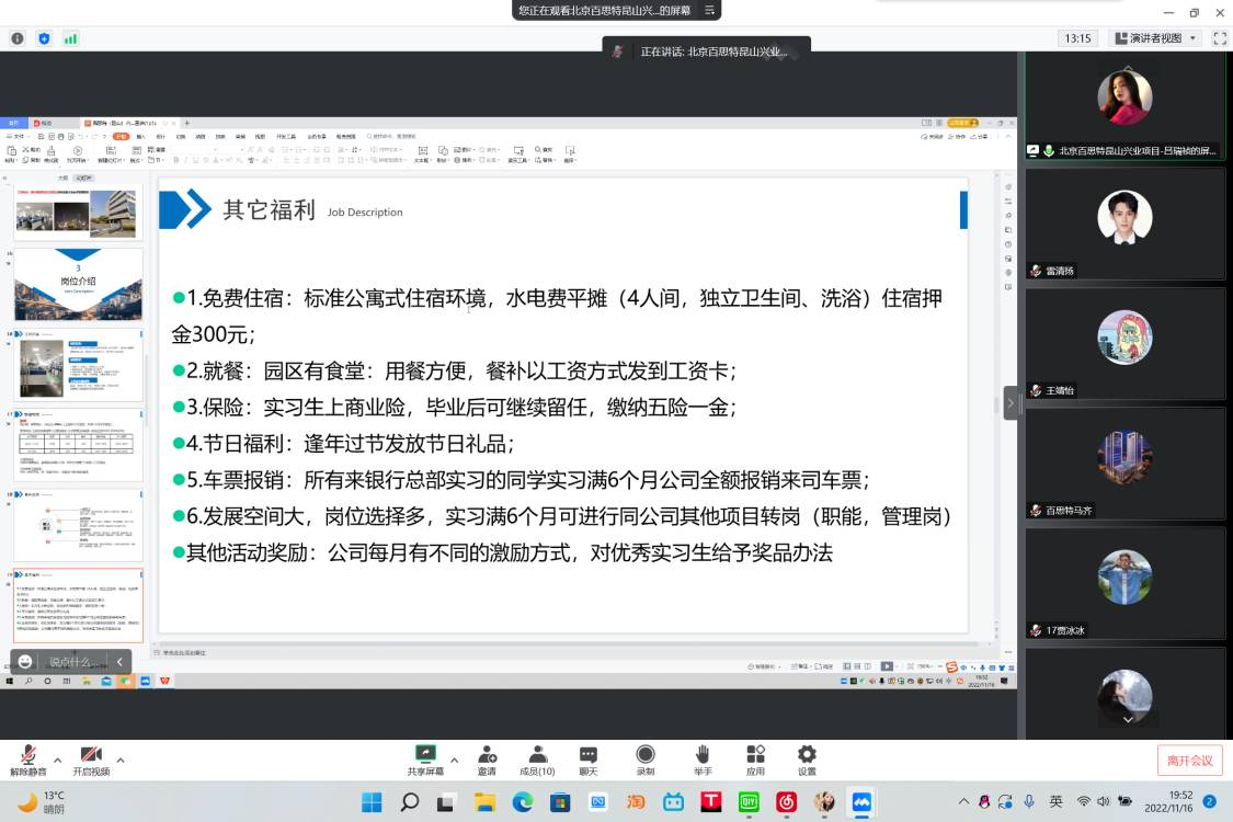 为扎实推进williamhill英国毕业生就业工作的顺利进行,提高我院毕业生就业岗位专业对口率,助力我院每位毕业生找到心仪的工作,同时也帮助企业寻找和挖掘相关人才,助力双赢,经过我院就业专干和校招联系人刘阳老师与企业前期沟通,了解毕业生需求后,于11月16日晚19∶30我院举办百思特线上宣讲会,2023届毕业生以及科创部相关人员参与此次宣讲会。