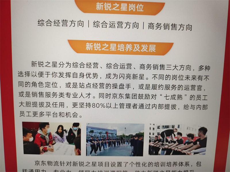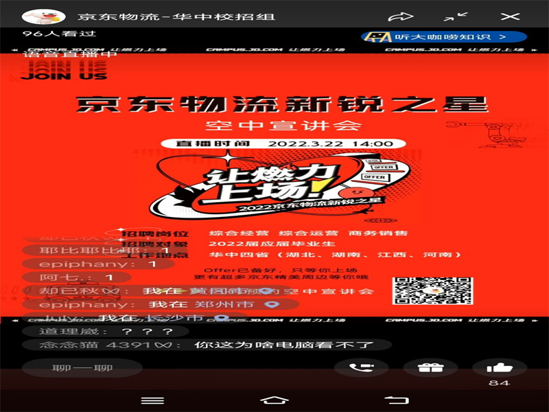 会议伊始,宣讲人员景老师与王老师进行自我介绍,讲述自己在京东物流的工作经历并表达新锐之星计划是为京东物流培养高素质人才,有极好的成长空间。随后景老师播放京东物流新锐之星计划宣传PPT,详细介绍了京东物流的企业文化,王老师又对京东物流的规章制度、福利待遇、产业结构、组织构架、人力资源政策等几个方面向同学们进行了简单的介绍,同时指出此次新锐之星招聘分为综合经营、综合运营、商务销售三大方向,工作地点在湖北、湖南、江西、河南四省,交代了线上招聘流程并现场解答了同学们的疑问。毕业生们积极参加此次宣讲会,有一百多人参与观看。最后,二人代表京东物流华中地区真诚的邀请我校同学加入京东物流新锐之星计划从而实现自己的梦想!