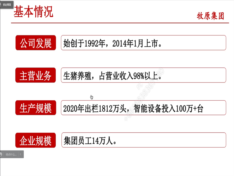 会议开始之前,主讲人以两则短视频展示了牧原集团的员工风貌和机械化养猪方式。随后,会议中首先介绍了公司的基本情况,牧原集团始创于1992年,并与2014年1月上市。主营生猪养殖,2020年出栏1812万头,集团员工14万人,企业规模大,全国24省300余家子公司全面布局,实力强劲。公司的热招岗位主要为销售类(销售管理、行情分析)、人力资源类(人力资源管理、企划宣传)、供应链类(贸易管理、采购管理、物流管理)、养殖管理储备干部、肉食管理储备干部等,底薪8000元,奖金丰厚,薪酬待遇高。