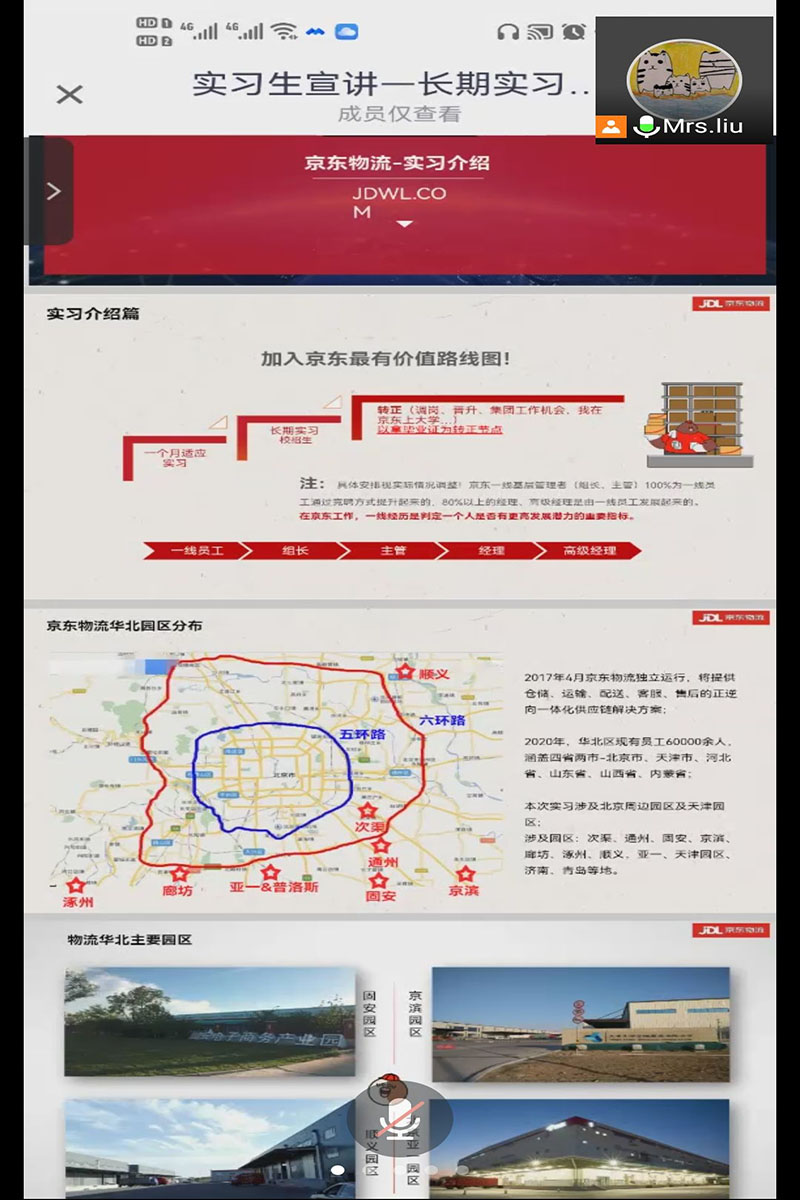 宣讲会上,公司校招负责人刘女士首先介绍了公司的基本信息,作为世界企业五百强之一,京东物流的定位是中国领先的技术驱动的供应链解决方案及物流服务商,始终以“技术驱动,引领全球高效流通和可持续发展”为使命,以“体验为本、技术驱动、效率制胜”为核心战略。京东物流覆盖全国几乎所有地区,目前有约十九万位配送员,八百多个仓库,是全球唯一拥有六大物流网络的智能物流企业。公司内部员工晋升空间大、速度快,一线基层管理者皆为一线员工竞争而晋升,80%的经理和高级经理是由一线员工发展起来的。此次招聘岗位是仓储管理员,负责货物的打包、上架、扫描、复核和异常订单处理,共招聘25人。实习地点位于北京,实习福利丰厚,实习期底薪4500元,享有意外伤害保险,公司报销来程火车票费,每月休息4至6天,每月330元餐费,住宿免费,转正后公司缴纳五险一金。内部活动丰富,气氛和谐温暖。