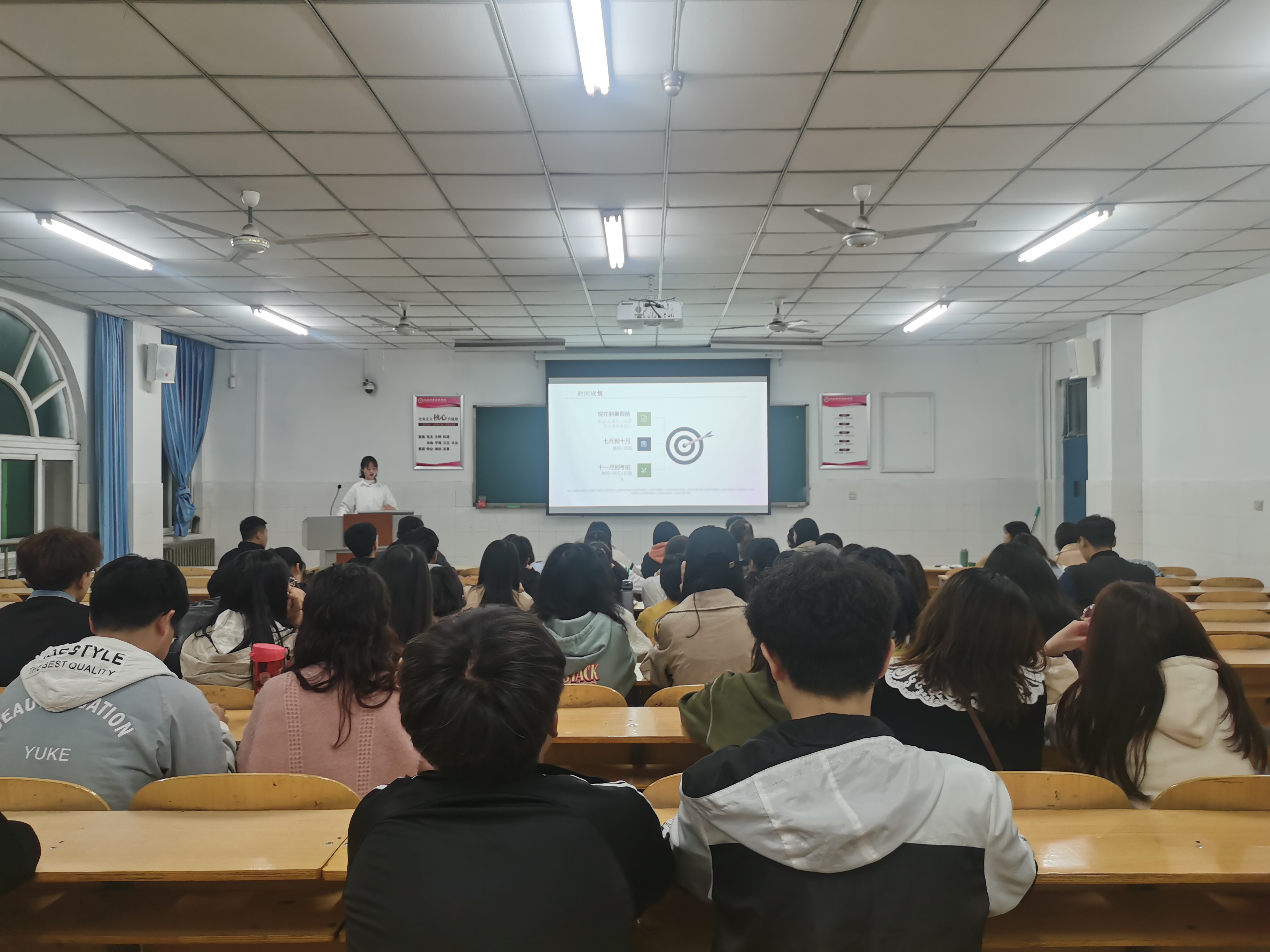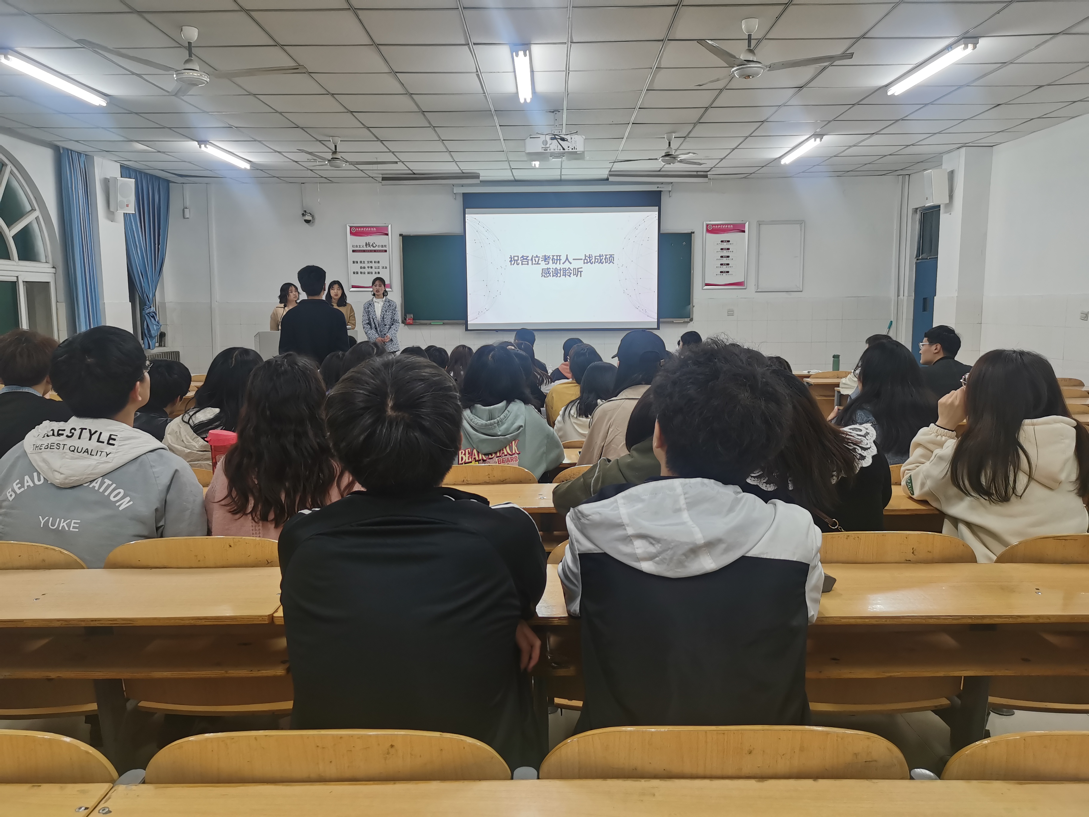 会议开始前,刘阳老师莅临现场,为考研学子加油打气,同学们鼓掌欢迎。会议开始,邓洋阳同学率先上台,为大家分享了一段在她考研时期一直激励她的视频,提出:“青春只有在奋斗中才能闪光,在拼搏中才能精彩”,以此来激励大家迎难而上,奋勇拼搏,同时她向大家分享了她在备考期间的复习步骤以及复习侧重点,着重强调刷真题的重要性。随后,张鑫同学向大家分享她在备考过程中的心得体会,从选择、效率、购买途径、坚持、技巧五方面现身说法,鼓励大家要学会总结最适合自己的模板,摸索出最适合自己的道路。接着,和佳美同学向大家强调选择的重要性,要收罗好广大信息,充分了解所报院校的信息,做好对专业书籍和真题的选择,避免踩坑。讲座结束后,大家积极地向他们请教,解除自己对考研的疑云,同时三位同学耐心解答,现场讨论热烈。