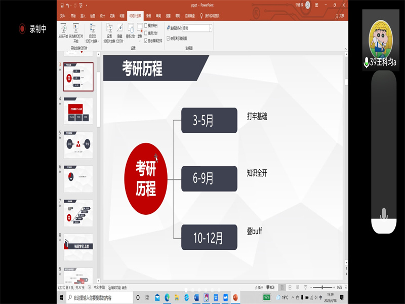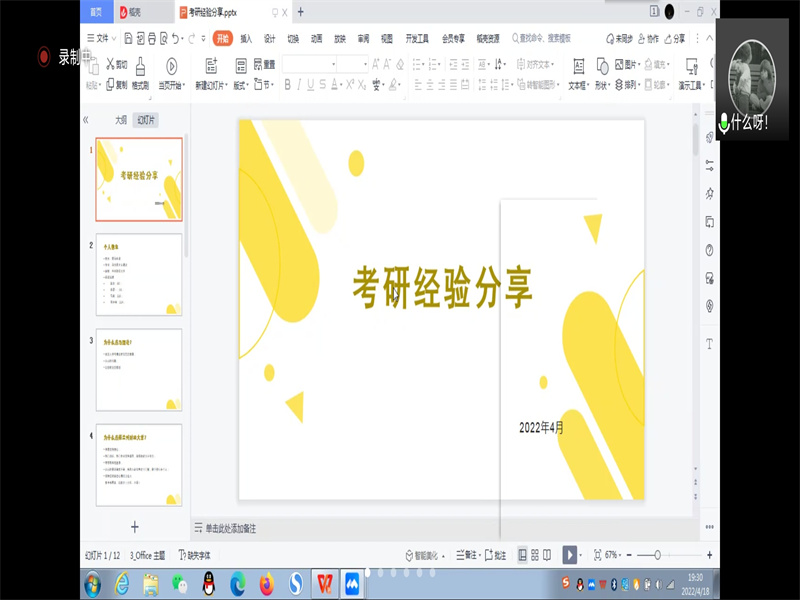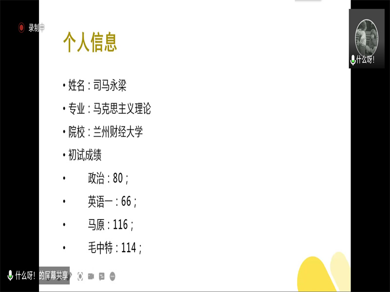 会上,首先由张宇飞同学分享他的考研经验,张宇飞同学考入了河南理工大学的物流工程与管理专业。他从选择考研资料和课程、推荐实用有效的比赛和分享个人经验三个方面为大家讲解,并建议大家参加工作春秋招,为自己铺设更多道路,根据自身情况来选择是否考研,不要盲目跟风。随后,考入南京邮电大学社会学专业的王科均同学进行分享。王科均同学通过分享他的跨专业考研历程来向大家分享经验。他着重强调了“思维导图”的重要性,通过思维导图使零散的知识形成一个完整的体系。最后是来自考入兰州财经大学马克思主义理论专业的司马永梁同学的分享。司马永梁同学首先介绍了自己选择马克思主义理论专业和兰州财经大学的原因,以此引出对选择学校和专业的见解。随后强调了心态的重要性,并分享自己调节心态的方法,希望大家能以良好的心态应对考研。三位同学利用详细精美的PPT分模块介绍举例,以切实感受带动同学们的思维,引起同学们的思考,引领同学们奔向考研的征程。