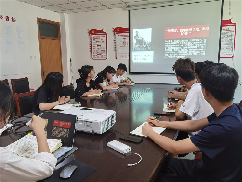 首先,由本期主持人刘丹阳向大家提出本次读书工作坊的主题——大学生的正确交友观,并借由诗人张岱的诗句,“人无癖不可与交,以其无深情也;人无疵不可与交,以其无真气也”,提出自己认为的第一条交友观即交友要有真情实意,又借用毛主席的话语,“待朋友,做事论理论法,私交论情”,提出第二条交友观即交友要切情有则。随后,主持人邀请在座同学依据上述人物事例来谈谈闪烁的人格光辉,参与的同学们也都针对这个问题展开了讨论,并且分享了自己和朋友之间的故事来发表自己对交友的看法。主持人将同学们的观点做出总结,交朋友最重要的就是要志同道合,真诚相待,共同进步。随后邀请尚津老师指导发言,老师提到《觉醒年代》中毛主席的征友启事以及他的作品《沁园春·长沙》中的恰同学少年,发表感想,同学们应该乐交诤友,交一些志同道合,三观一致的朋友。谈到交朋友是很有意义的,每个人都存在个体差异性,在广泛的交友中可以得到不同的感觉。最后,尚津老师送个同学们一句鲁迅先生的话,“愿中国青年都摆脱冷气,只是向上走,不必听自暴自弃者流的话。能做事的做事,能发声的发声。有一分热,发一分光,就令萤火一般,也可以在黑暗里发一点光,不必等候炬火”。告诫同学们在交友中应该严以律己,宽以待人,学会多包容他人,至此本次读书工作坊到此圆满结束。